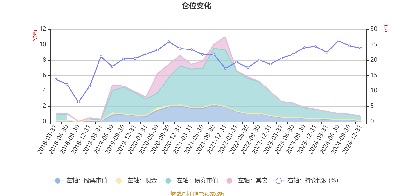据定期报告数据统计,近三年平均股票仓位为22.02%,同类平均为18.51%。2024年上半年末基金达到26.28%的最高仓位,2018年三季度末最低,为6.35%。